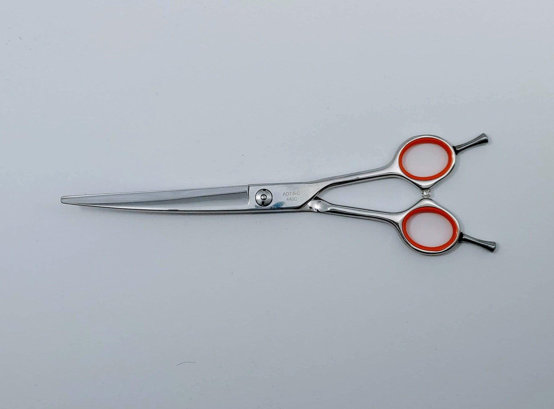 Curved blade, overall 7.5 inch length with even handles and double removable finger rests. Long curved shears can cut some amazing effects in shaping and texturizing hair. Orange screw and removable comfort rings. Quality preferred by celebrity hair artists but useful, even for discerning barbers and groomers.