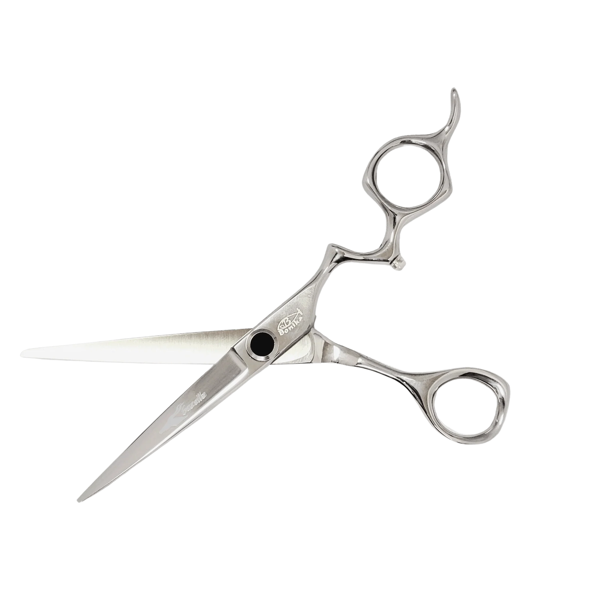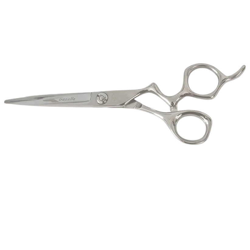 The Bonika Gazelle 5.75-inch/6.25-inch shears feature a uniquely shaped drop-finger handle for enhanced control and comfort during cutting. This is a style preferred by those who speed cut or freehand cut. Coupled with the contoured thumb, these shears are designed for those who hold their shears in a traditional grip or for those who hold their shears closer to the palm. It is good for both wet and dry cutting. The weight is 2.5 oz with size B finger and thumb holes.