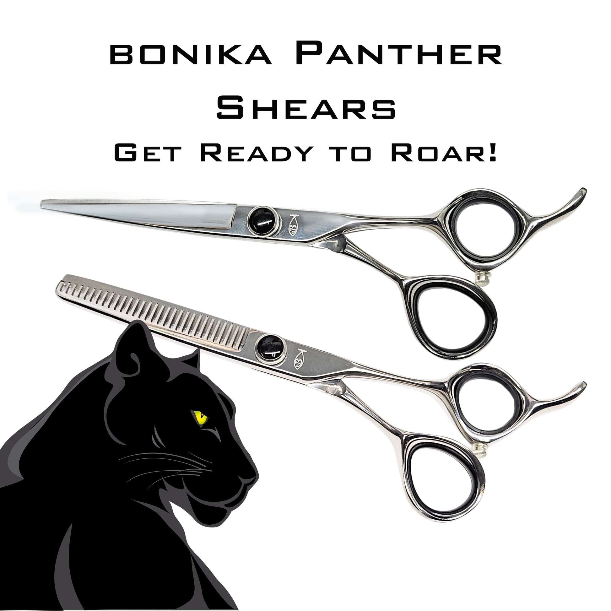 Experience precision with the Bonika Panther Shears—crafted from lightweight, high-carbon steel for seamless cutting on both wet and dry hair. Their panther ear-shaped, contoured handles provide a comfortable grip, especially suited for smaller hands. Featuring a glossy black thumb tension screw, these shears combine style with functionality. Achieve salon-level precision with every snip. Available in a smooth 6" convex shear or a matching 30-tooth blending thinning shear. Each shear weighs 2.4 oz and is sold individually.